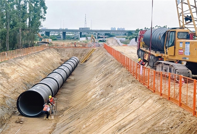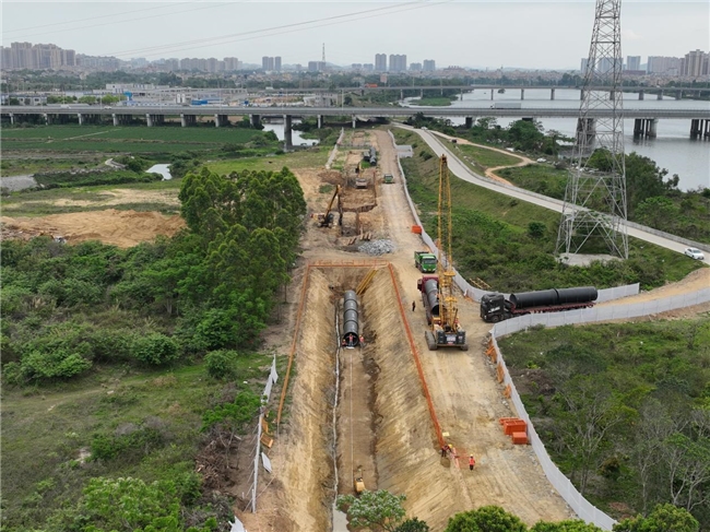 管道安裝施工現場 作為廣東省重點建設工程、陽江市十件民生實事之一,中交四航局陽江水資源項目計劃以陽春市大河水庫為取水水源,通過新建引水隧洞、輸水管道,將優質水源引入陽江市,工程設計最大取水規模為83.6萬噸/日,輸水線路總長約57.7公裏。 此次安裝所用的球墨鑄鐵管,是工程輸水主幹線的核心材料,管節長度6米,每根重量約9噸,具有高強度、高韌性、耐腐蝕、使用壽命長、密封性能優良等突出優勢,能夠有效保障長距離輸水線路在長期運行中的安全性與穩定性,減少滲漏風險,確保從陽春大河水庫引出的優質原水在輸送過程中水質不受汙染和損失。